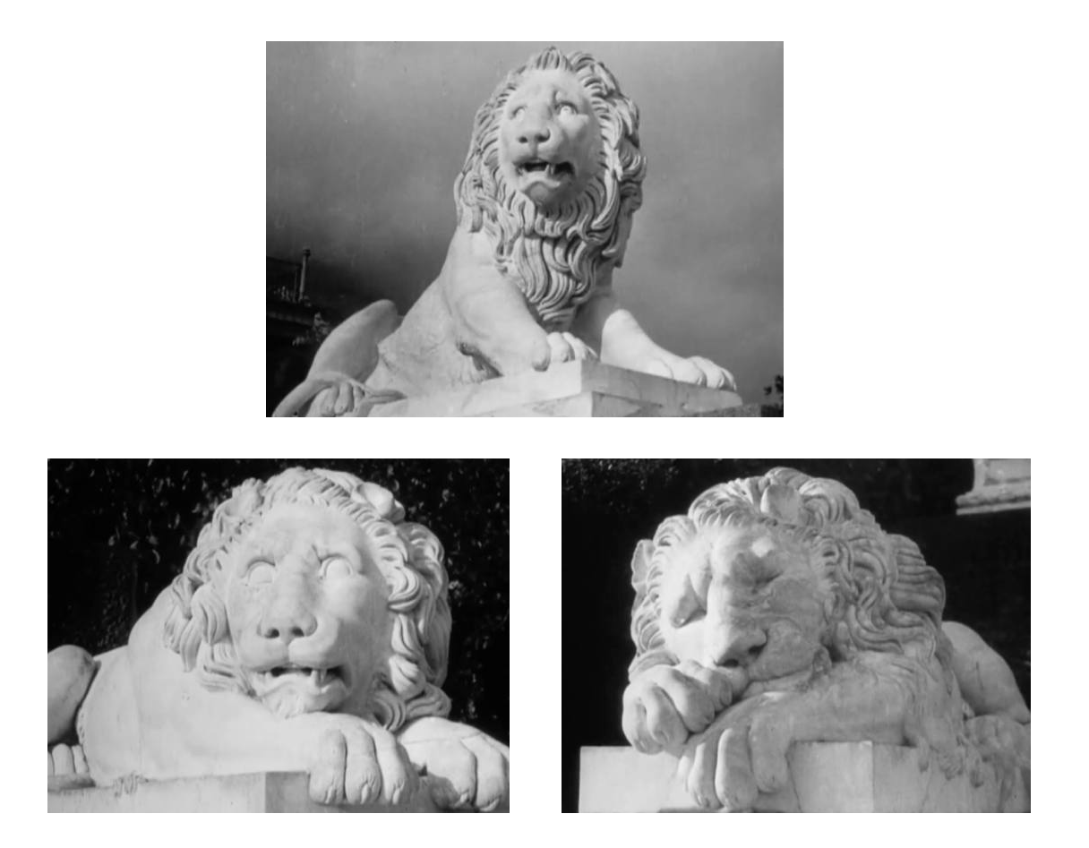 Тут же, в момент ответного залпа броненосца, возникают (теперь уже хрестоматийные) крупные планы льва: короткий монтаж трех мраморных изваяний — лев спит, лев проснулся, лев взревел! Знаменитая кинометафора возникла спонтанно — увидев этот зверинец в алупкинском парке, режиссеру пришло озарение — «просыпающийся лев» великолепно дополнит монтажную фразу, начатую выстрелом «Потемкина»: