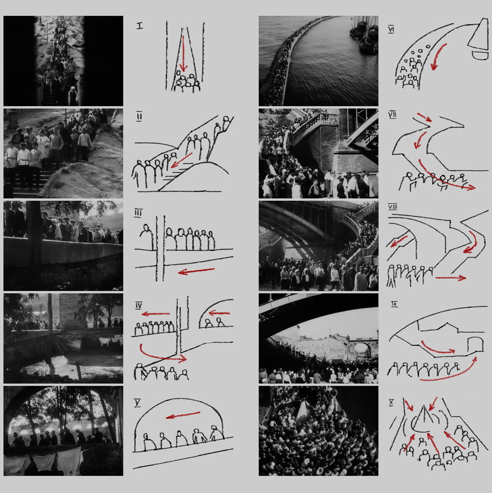 Тиссэ нашел ту единственную точку съемки и объектив, при которых статуя именно возвышалась над лестницей. За рамками кадра остались ноги и пьедестал — и вот уже шеренга солдат выплывает из-под нижней кромки экрана, врезаясь в толпу.