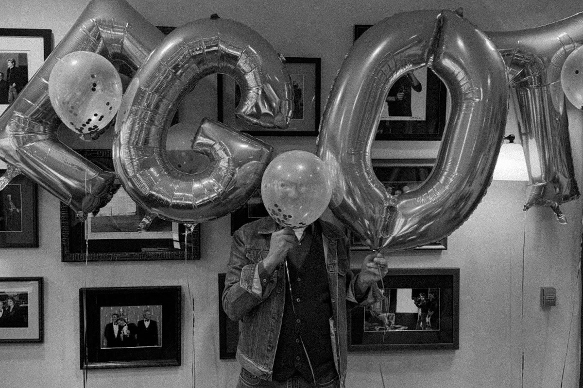 Стивен Спилберг на вечеринке у себя дома. Стесняется и прячет лицо за воздушным шаром.
