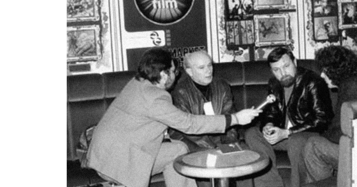 Лауреаты II МКФ: режиссеры Алексей Ханютин (СССР), Виктор Косаковский (СССР), Жером де Миссольц (Франция), Харриета Эдер и Томас Куфус (Германия) | Интервью для прессы на II МКФ, кинокритик Абрам Клецкин (в центре) и режиссер Геннадий Лысяков